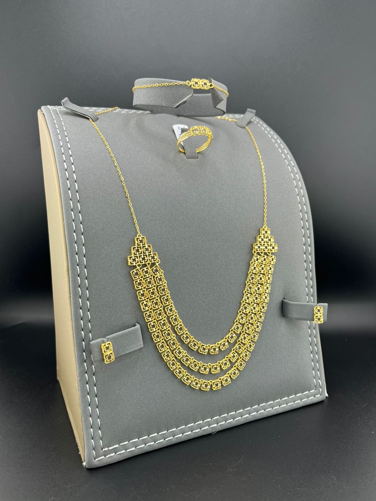 يتألق بألوان الفخامة والبريق، حيث تتلألأ القطع الثمينة تحت أضواء هادئة تبرز جمال التفاصيل الدقيقة. تُعرض الأساور، الخواتم، والعقود بترتيب أنيق يعكس جودتها العالية وتنوع تصاميمها التي تناسب جميع الأذواق.